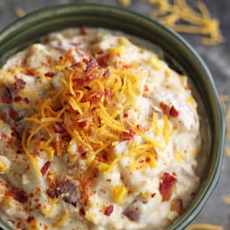 - Stir in diced onion, onion salt, black pepper, and smoked paprika. Cook about 5 minutes, then stir in corn, crumbled bacon, and shredded cheese. Stir until cheese is melted. Add water, one tablespoon at a time, to thin to desired consistency. Top with additional bacon and cheddar cheese if desired.