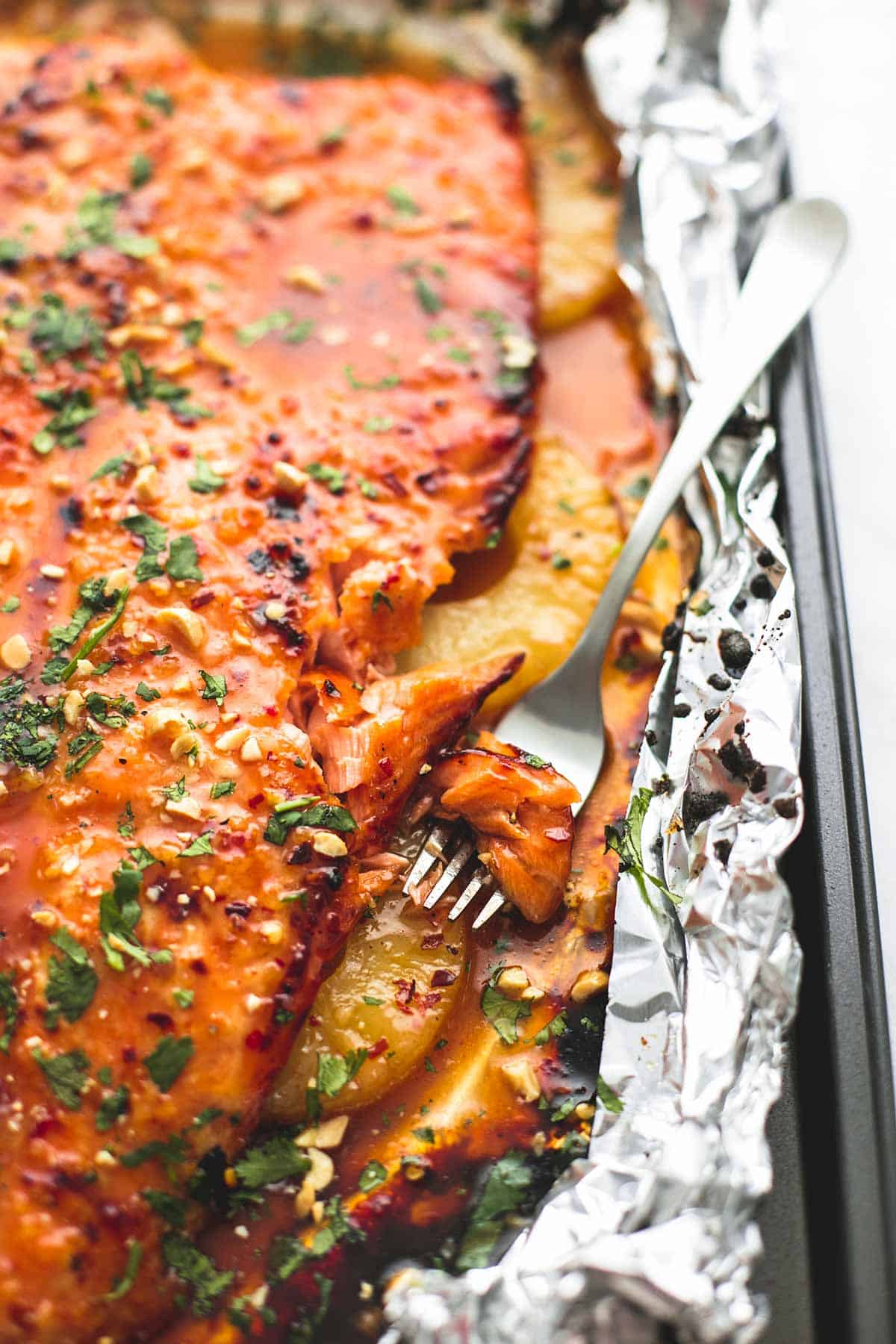 Baked Thai pineapple salmon in foil is an easy and healthy 30 minute salmon dish with a sweet and spicy sauce and juicy pineapple all made on one pan with minimal cleanup and maximum flavor.
