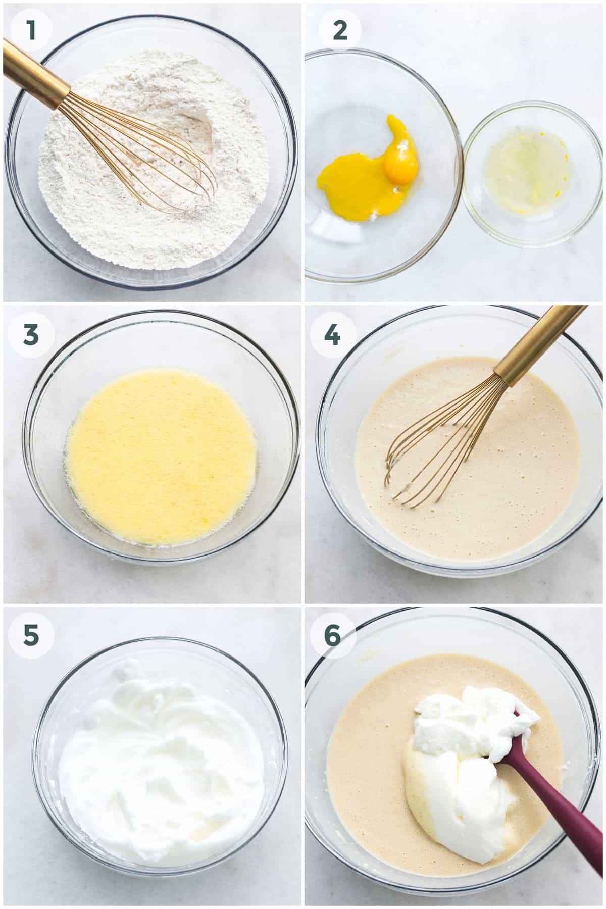 - Turn your attention to the egg whites. Whip them for 2-3 minutes (I used an electric hand mixer on medium-high speed), or until stiff peaks form. Then, fold the egg whites into the waffle batter. (photo 5-6)
