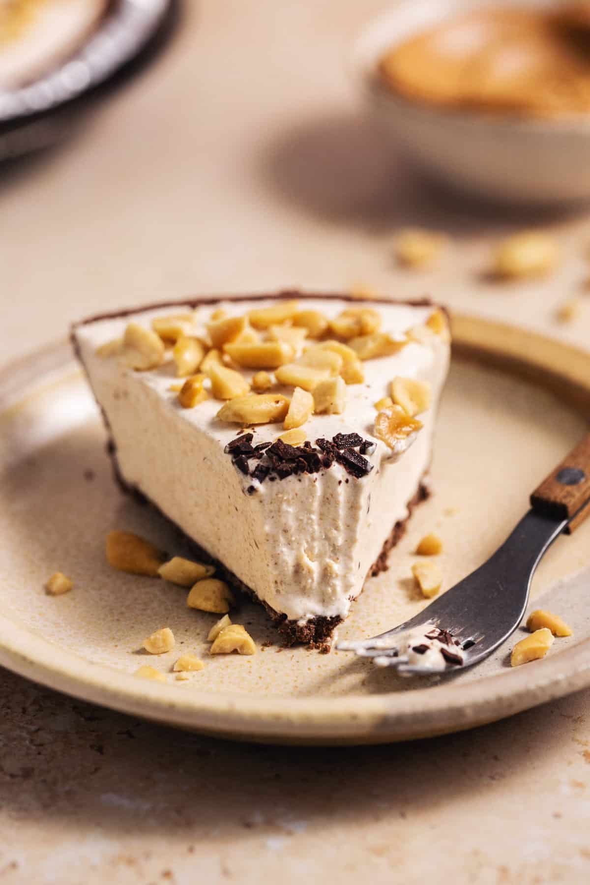 - Top the frozen pie with the remaining chopped peanuts and chocolate shavings if desired. Transfer to the fridge to thaw for about 30 minutes before serving. (see below)