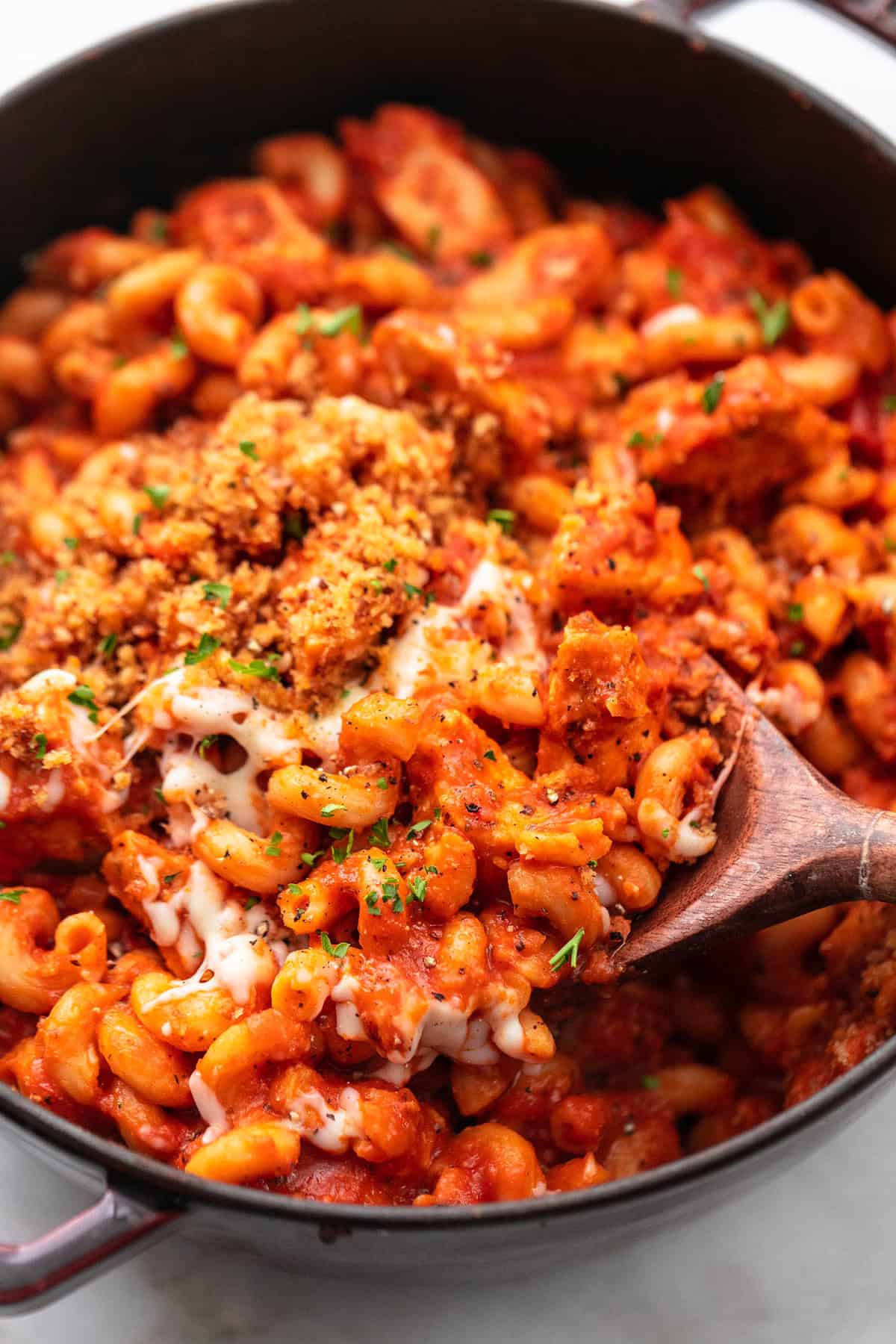 - Top pasta with remaining mozzarella cheese and cover until melted. Sprinkle with breadcrumb, transfer to oven and broil for 1-2 minutes until breadcrumbs are toasted. *If you are not using an oven-safe pot or skillet, you can toast the breadcrumbs in a pan over medium heat, stirring throughout, for 3-4 minutes before sprinkling over pasta.