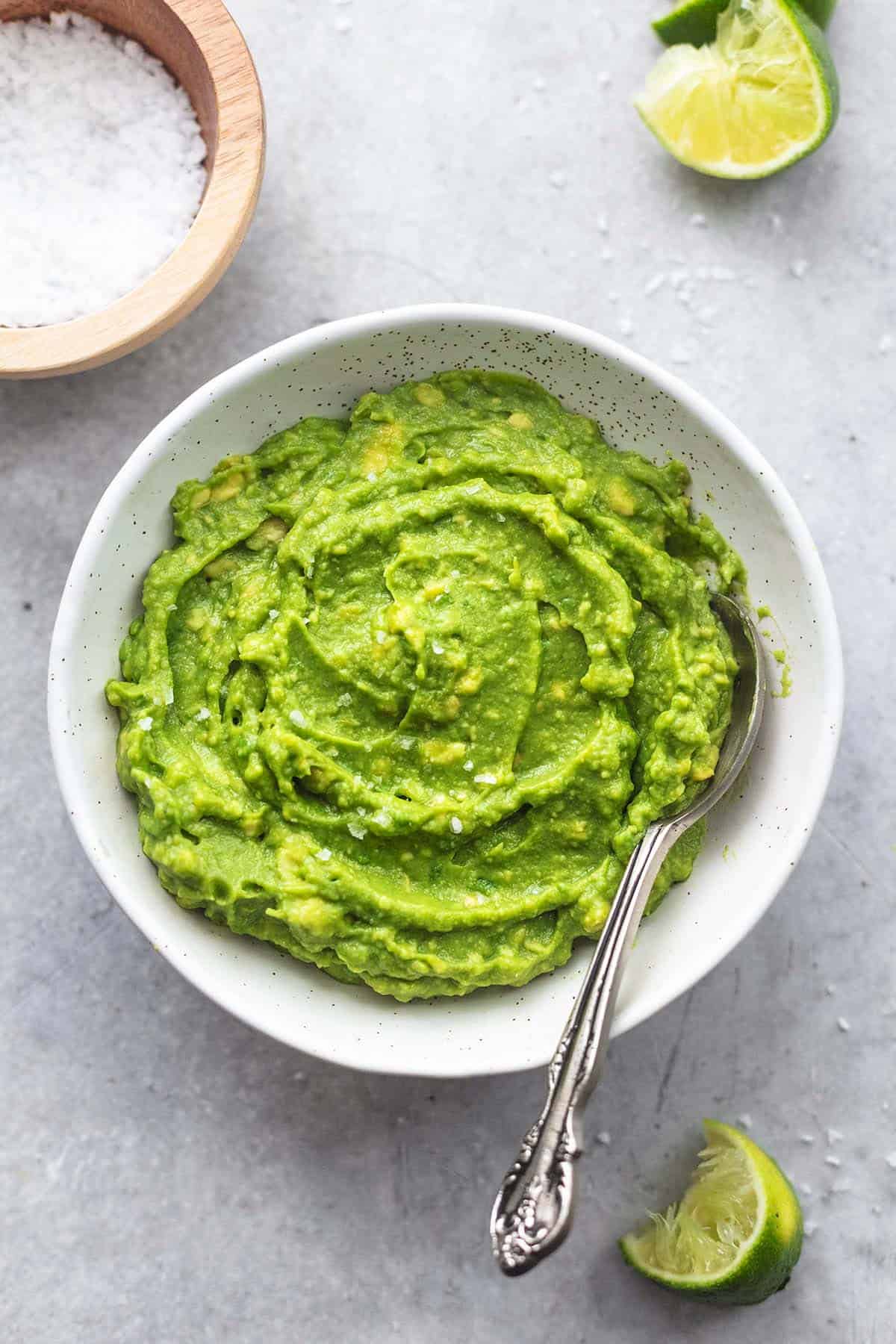 A few years ago, the hubs and I took a cruise to Mexico where we ate at an outdoor restaurant where the servers made guacamole right at the table. I watched him use avocados, lime juice, salt and, wait for it…nothing else. It was the actual best guacamole I’d ever eaten and since then, I have been making my guacamole like this (usually weekly as we LOVE guac in our house, even my little kids), bringing it to parties, and serving it when we have company, and it never fails to impress!