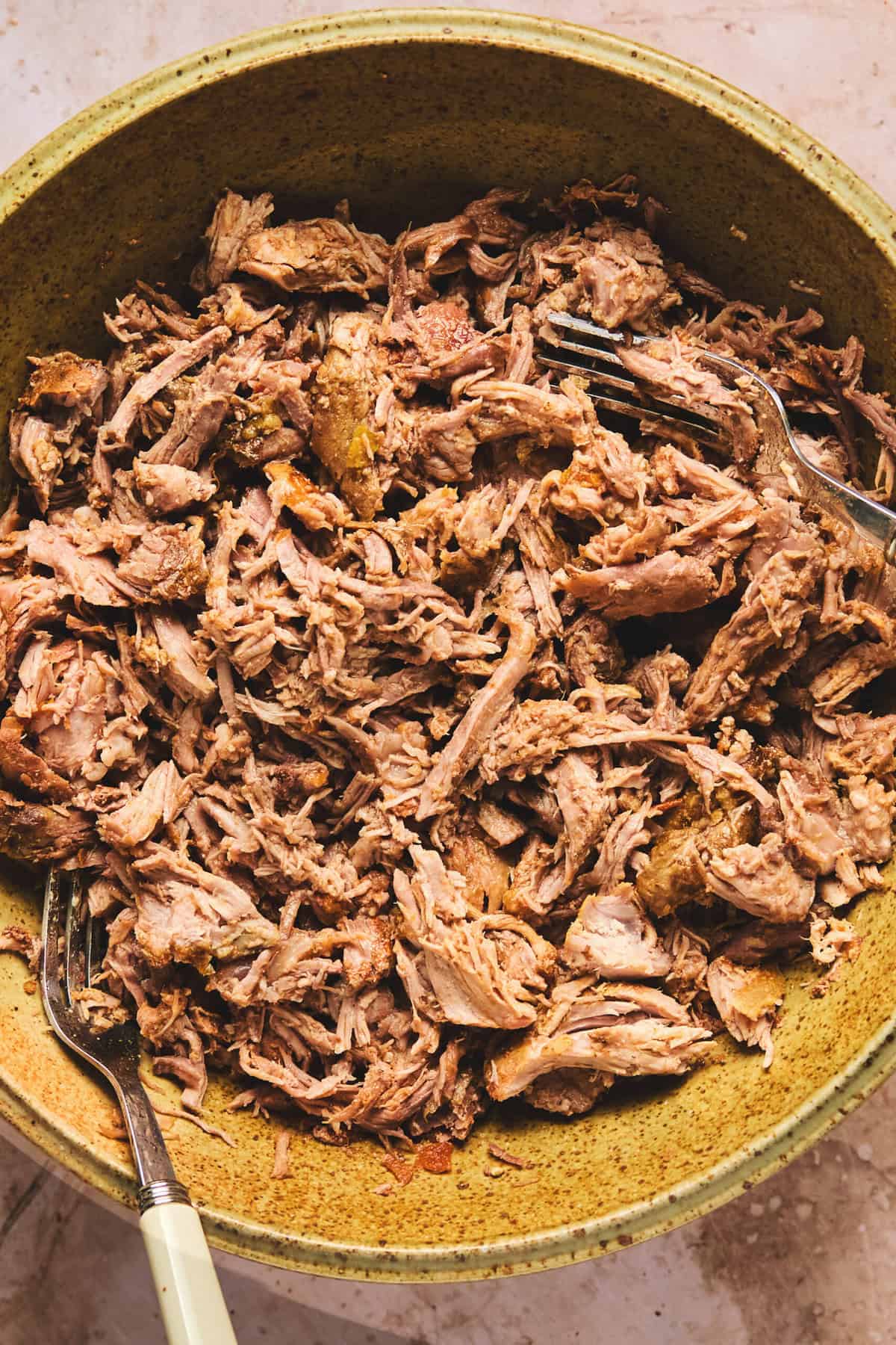 • Transfer the pork to a bowl and shred with two forks. Pour the sauce through a strainer and skim the fat with a spoon or a fat separator if you like. Add enough sauce to the pork to moisten it.